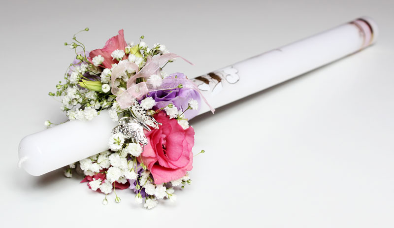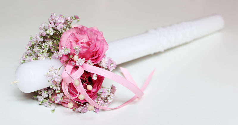 Chrzest święty to pierwsza ważna uroczystość Małego Człowieka. Na tą okazję proponuję przede wszystkim delikatne bukieciki i dekoracje gromnicy, do wykonania których używam drobnych i nietrujących kwiatów.