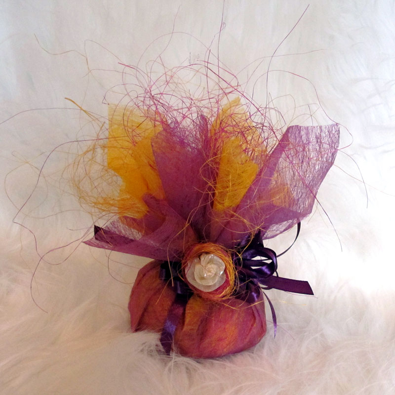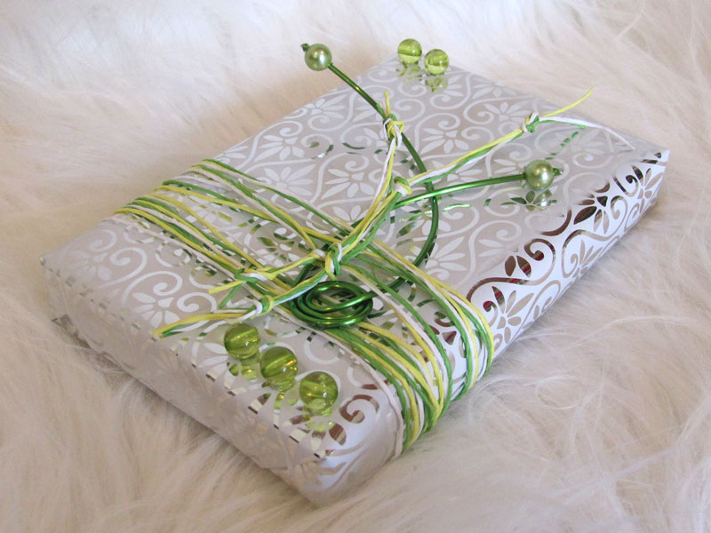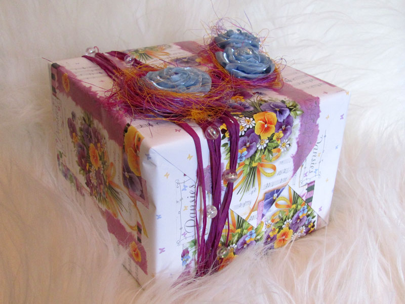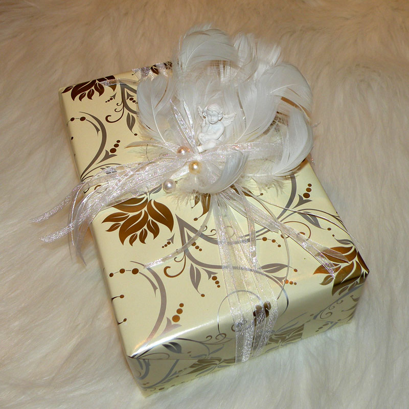 Prezent komunijny; papier metalizowany, tasiemka szyfonowa, piórka, ceramiczny aniołekPrezent walentynkowy; flizelina, sizal, tasiemka, różyczkaPrezent urodzinowy; papier metalizowany, papierowy sznurek, drut, koralikiPrezent urodzinowy; papier drukowany, sizal, rafia, różyczki, koraliki